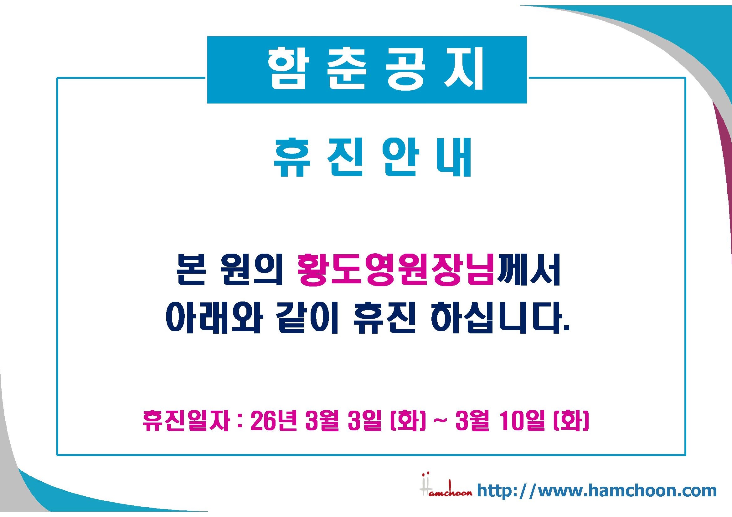 3월3일(화)~10일(화) 황도영원장님 휴진안내